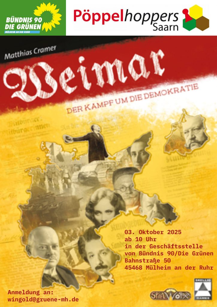 In dem Brettspiel „Weimar – Der Kampf um die Demokratie“ können vier Spieler*innen in die Rollen der vier großen Parteien der Zeit schlüpfen. Als KPD, SPD, Zentrum oder DNVP lenken sie das Schicksal der jungen Demokratie. Die Pöppelhoppers Saarn und Bündnis 90/Die Grünen bieten dazu in Kooperation am 03. Oktober 2025 die Möglichkeit, dieses einzigartige Spiel auszuprobieren.